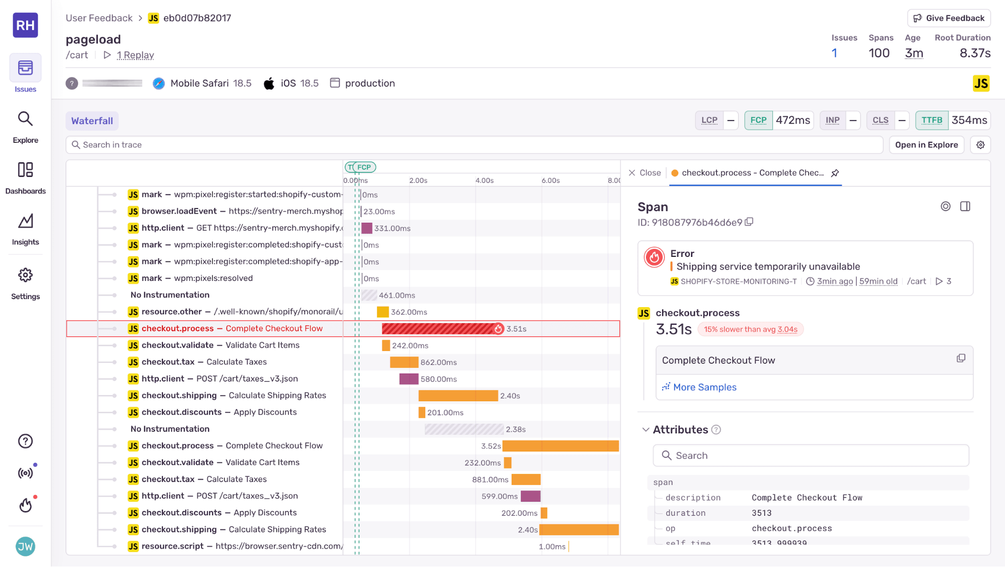 Each feedback entry links to detailed performance traces showing exactly which step in the checkout process failed, how long each operation took, and what the user experienced during the entire flow. Having this full context cuts down guesswork by directly linking technical issues to user frustration and checkout abandonment.