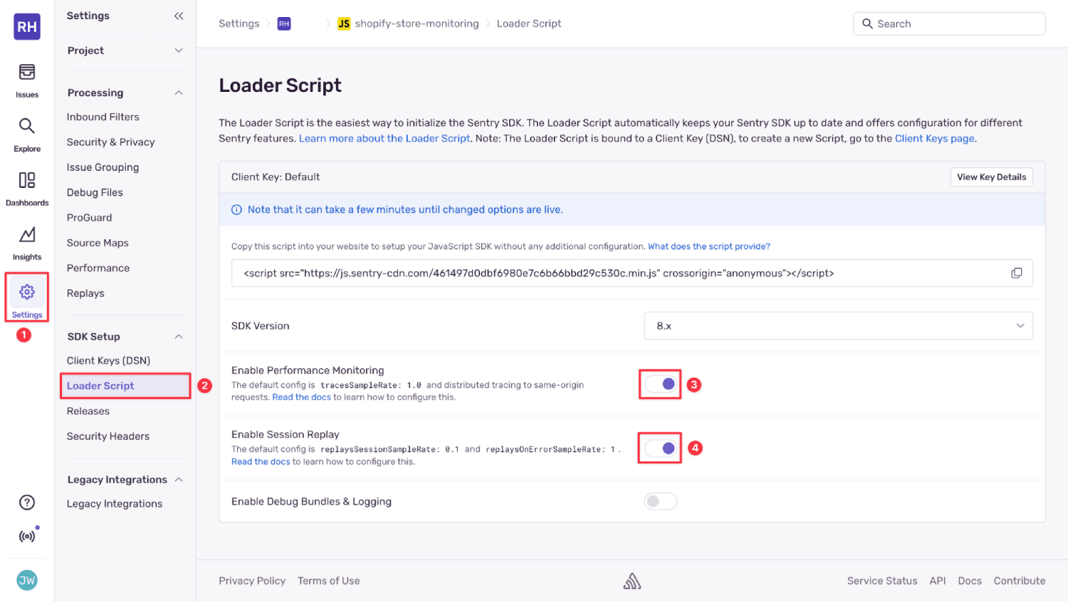 Next, enable monitoring features in the Sentry project settings. Navigate to Settings → SDK Setup → Loader Script and toggle on Enable Performance Monitoring and Enable Session Replay. Copy and save the loader script URL that appears (it will look like https://js.sentry-cdn.com/[hash].min.js) - you’ll need this in the next section.
